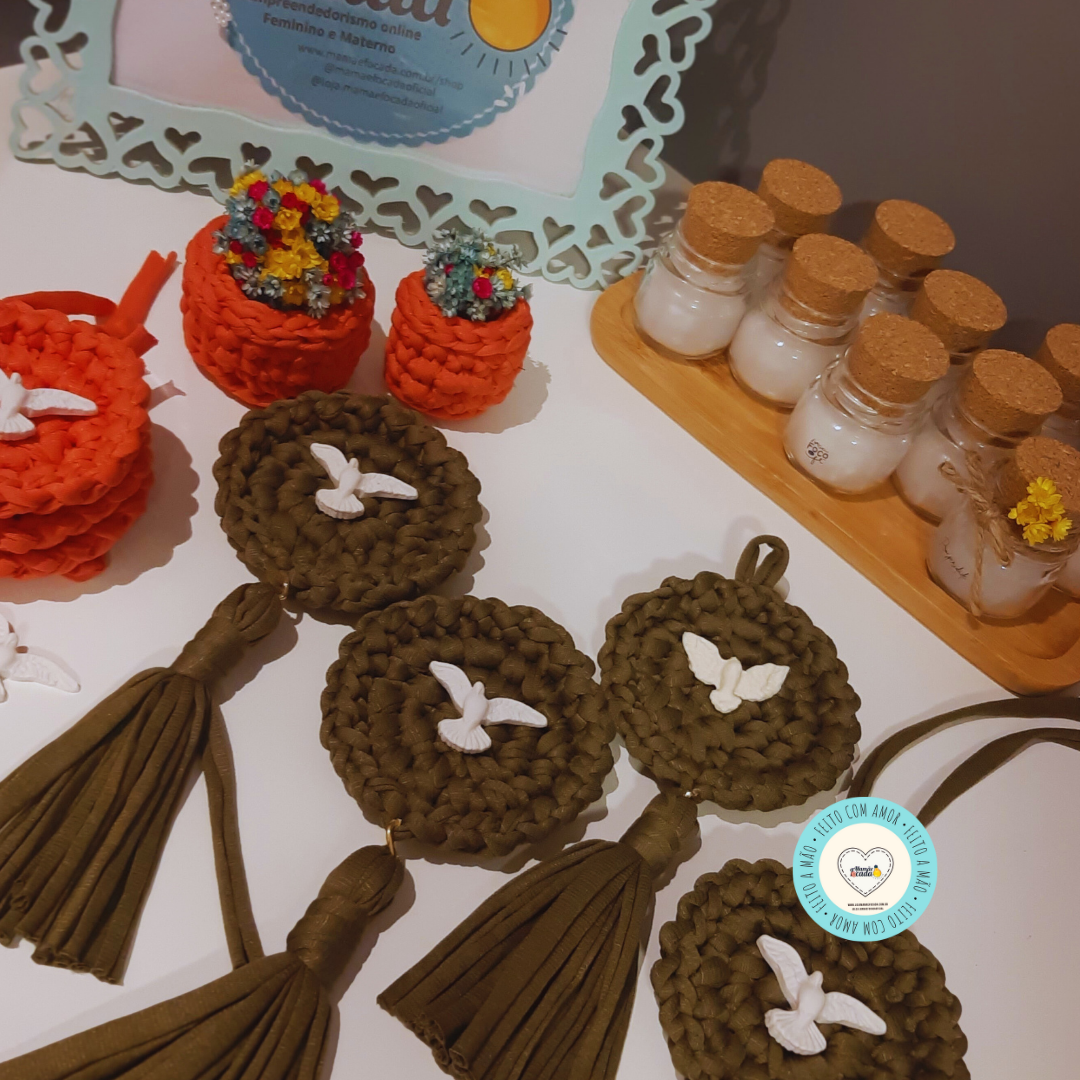 Mandalas feitas de crochê em fio de malha com aplique de pombinhas "mini divinos". Lembranças personalizadas, podem ser usadas em datas comemorativas, batizado, primeira eucaristia, crisma, lembrança maternidade etc.Embaladas individualmente em saquinho organza.